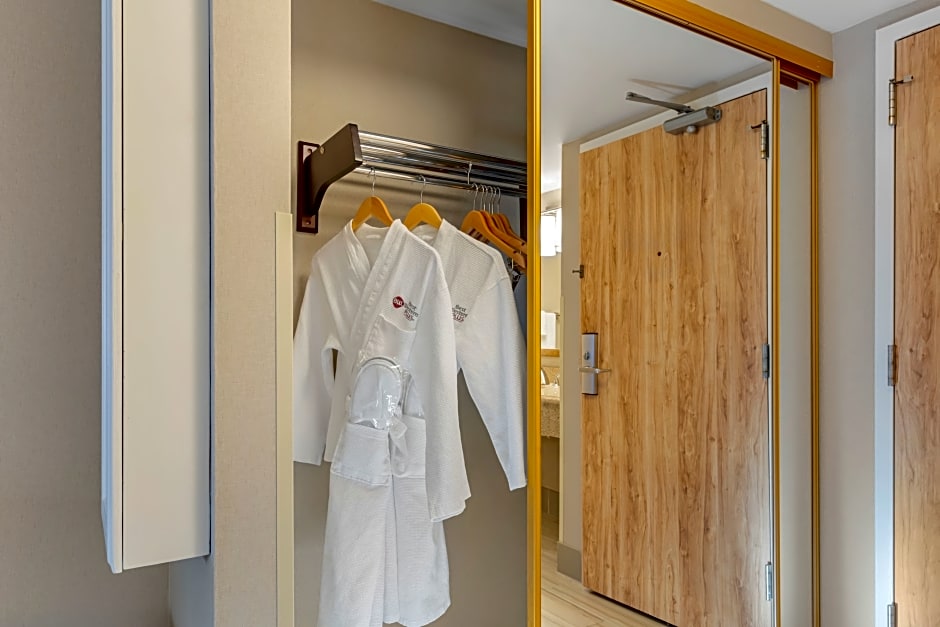 There is space for 2-4 guests in our non-smoking room with 2 queen beds. Located on the freeway side of our hotel, this room includes a coffee maker, hairdryer, iron and free high-speed Internet access for your convenience. Start your day with our complimentary full breakfast of waffles, eggs, 100% Arabica coffee, tea, pastries and breads, fresh fruit, yogurt and hot and cold cereals.